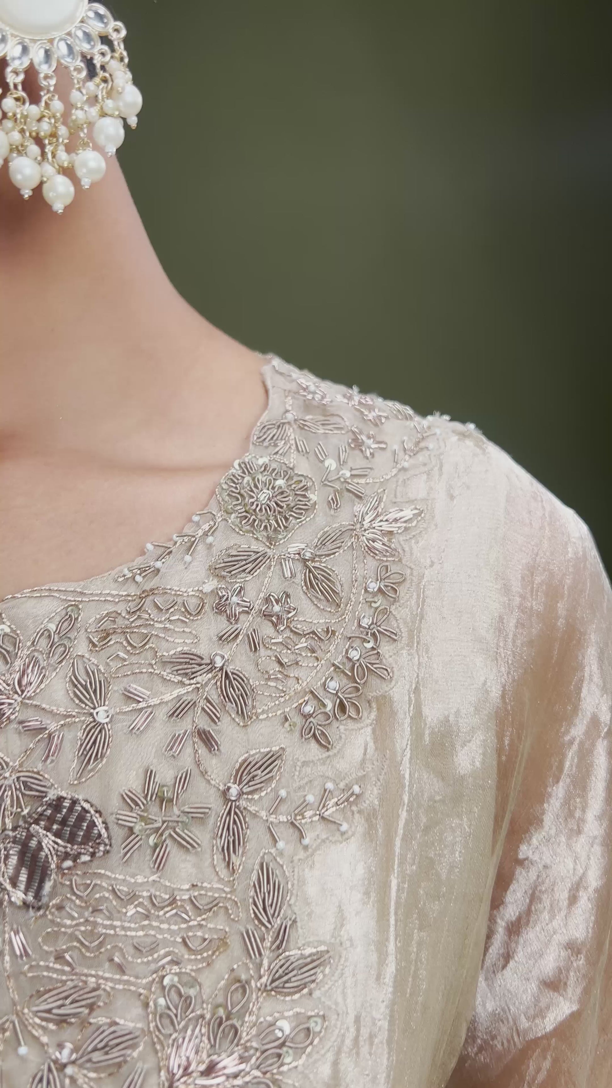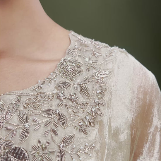 Beige Zardosi Embroidered Kaftan Style Tissue Kurti-JE4461