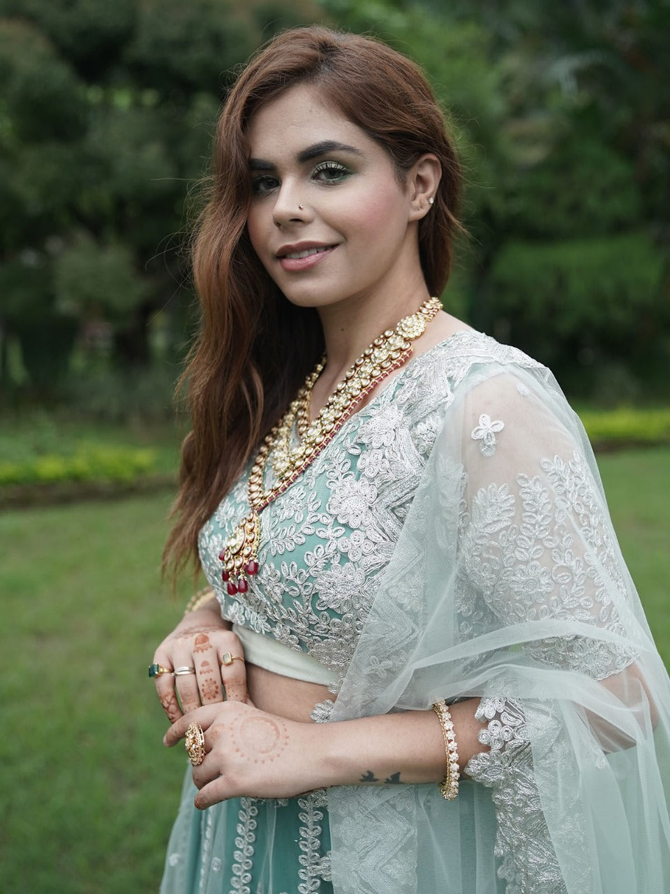 Odette Women Green Net Semi Stitched Lehenga With Unstitched Blouse