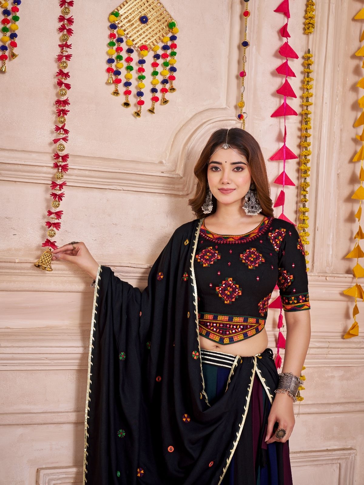 Odette Black Cotton Blend Solid With Golden Border Semi-Stitched Lehenga For Women