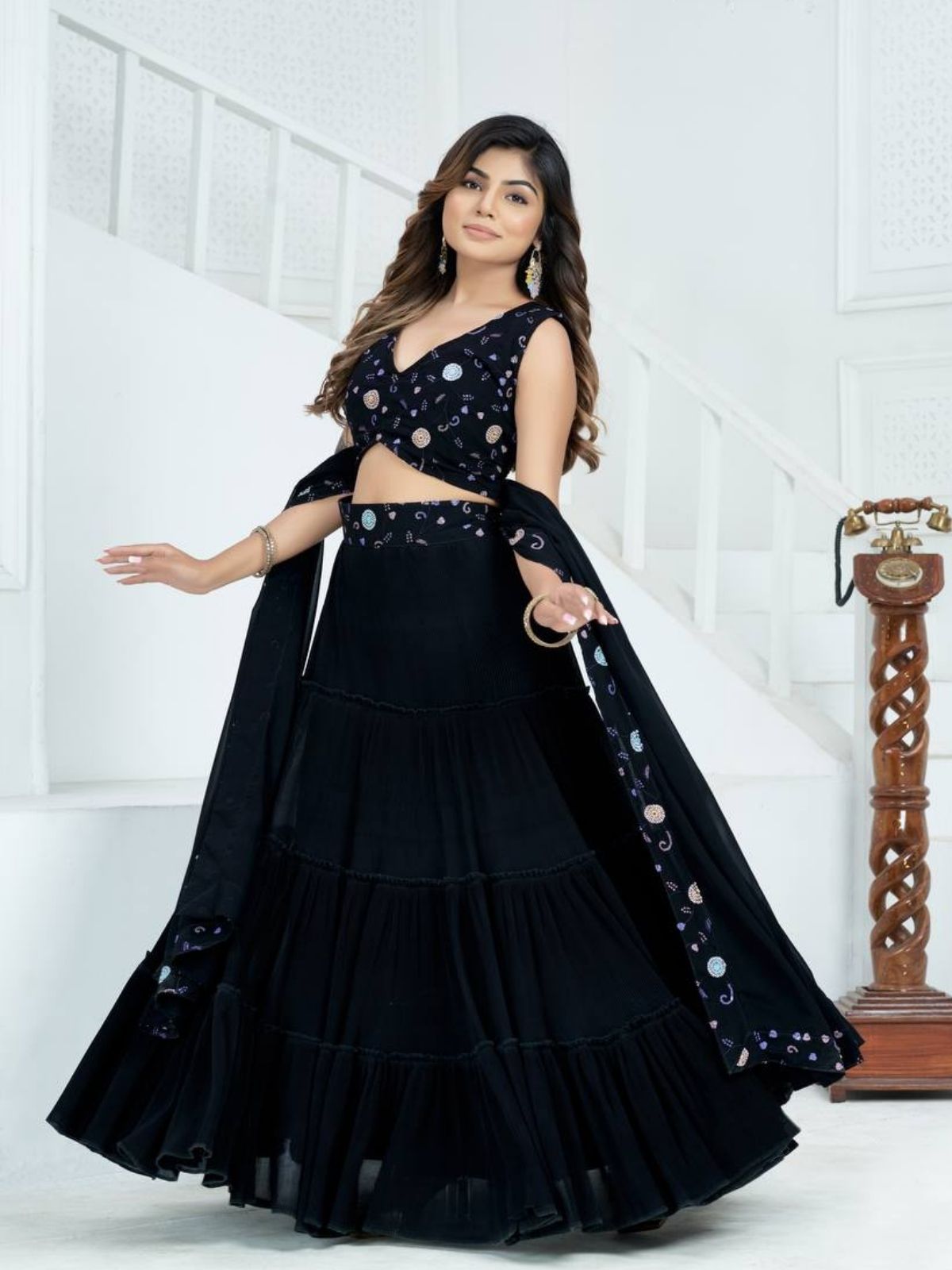 Odette Black Georgette Embroidered Semi-Stitched lehenga For Women