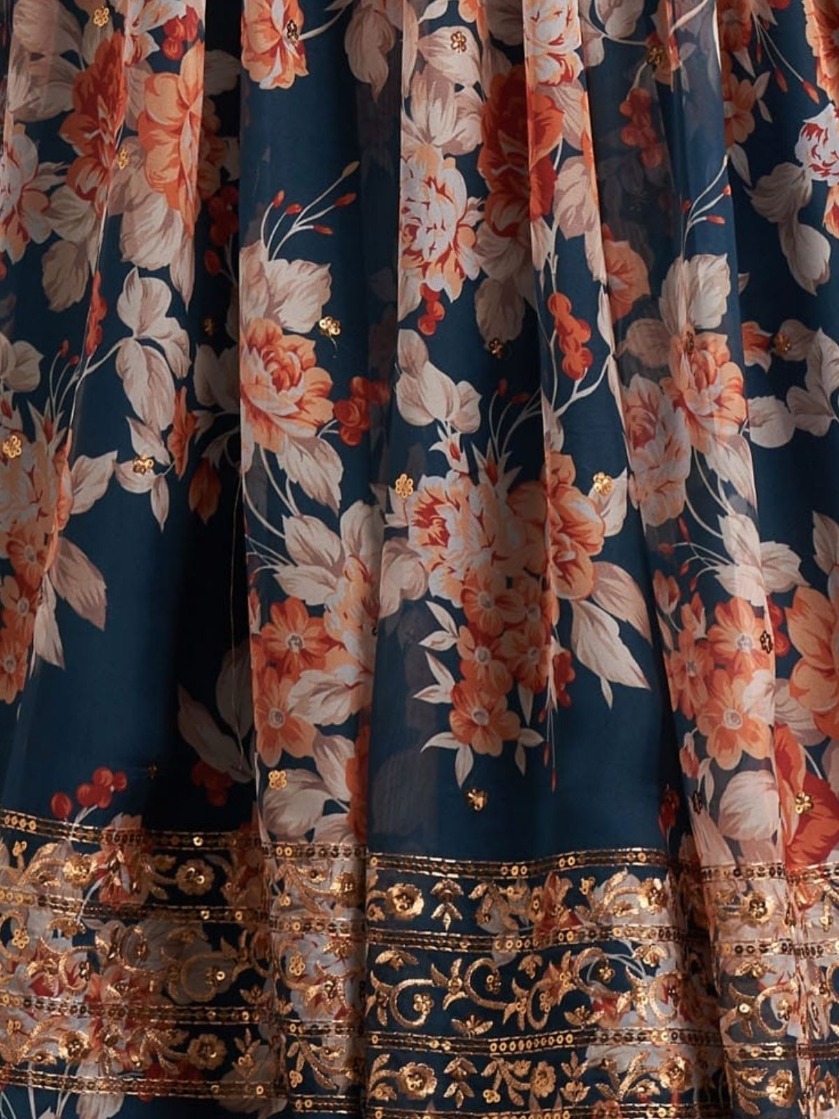 Odette Blue Organza Printed Semi Stitched Lehenga With Unstitched Blouse For Women