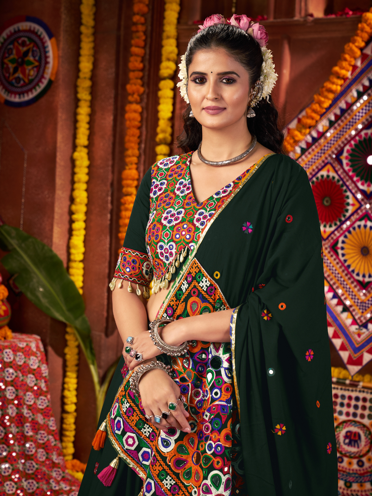 Odette Dark Green Cotton Blend Embroidered Semi-Stitched lehenga For Women