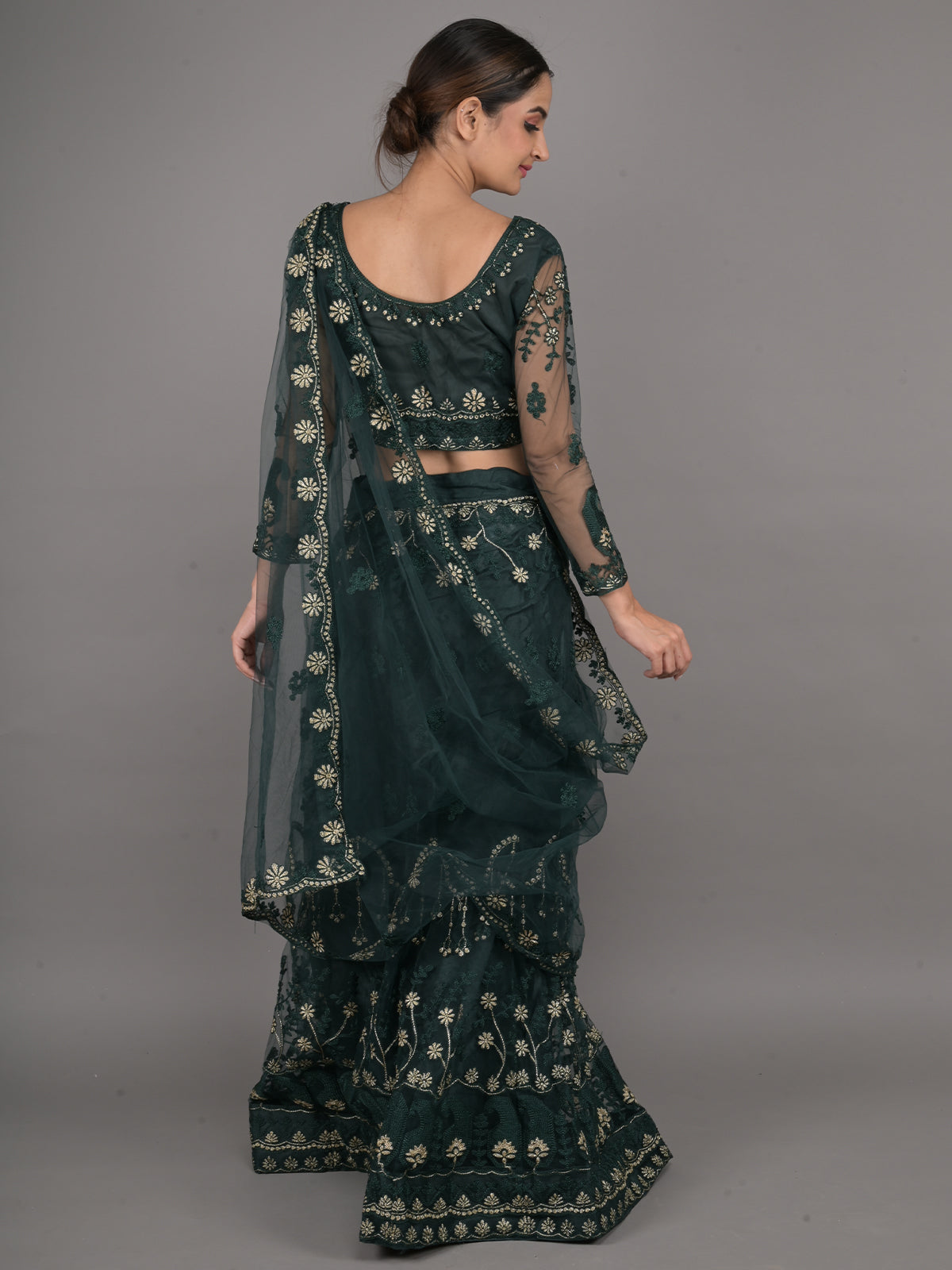 Odette Dark Green Embroidered Net Stitched Lehenga Set For Women