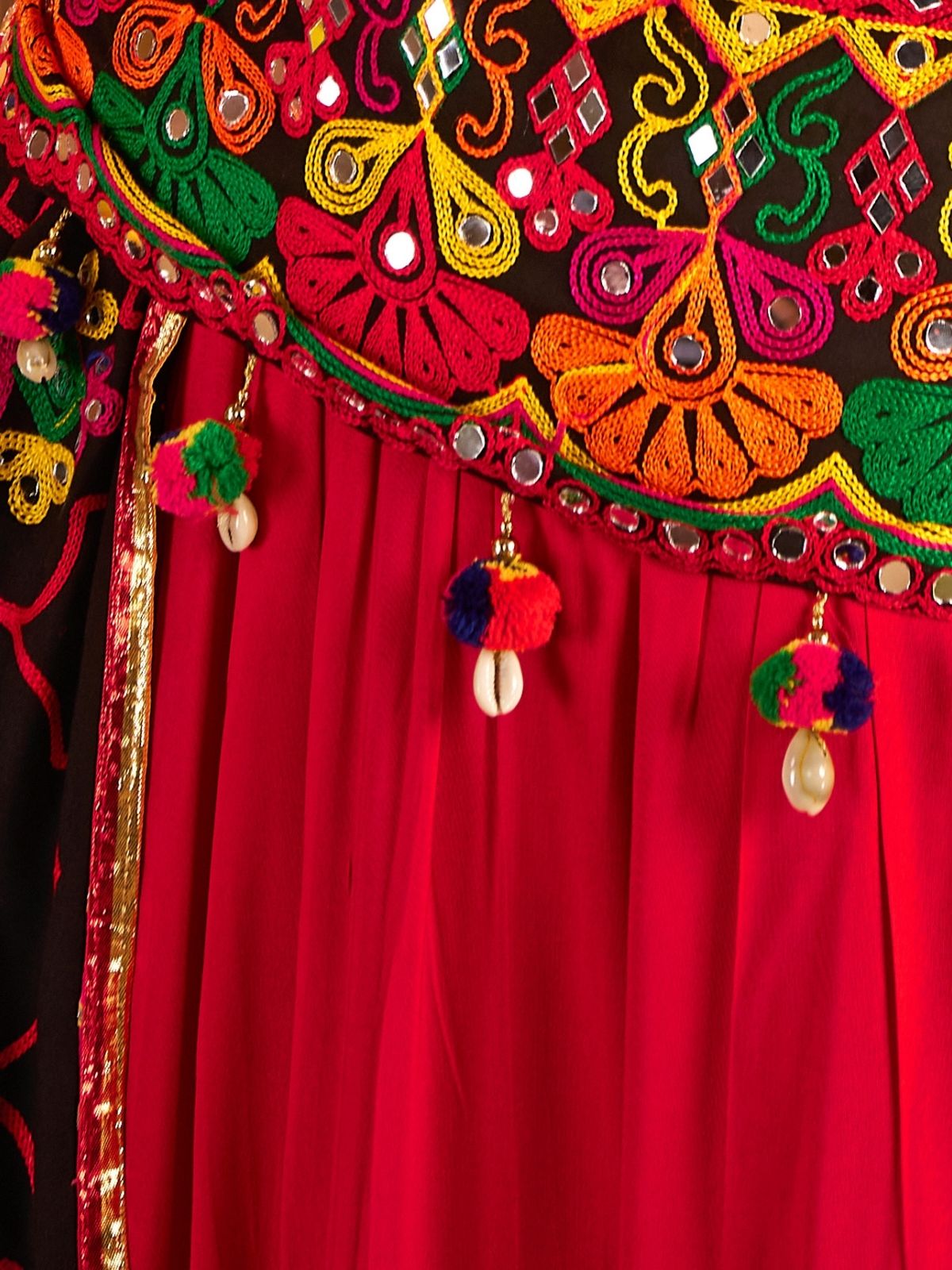 Odette Multicolor Viscose Cotton Embroidered Semi-Stitched lehenga With Stunning Tassels And Embroidered Waist Belt For Women