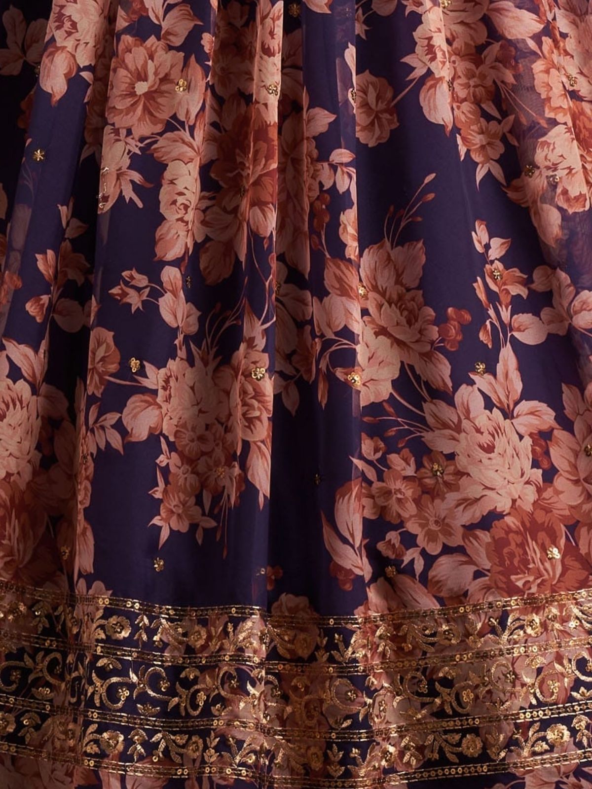 Odette Purple Organza Printed Semi Stitched Lehenga With Unstitched Blouse For Women