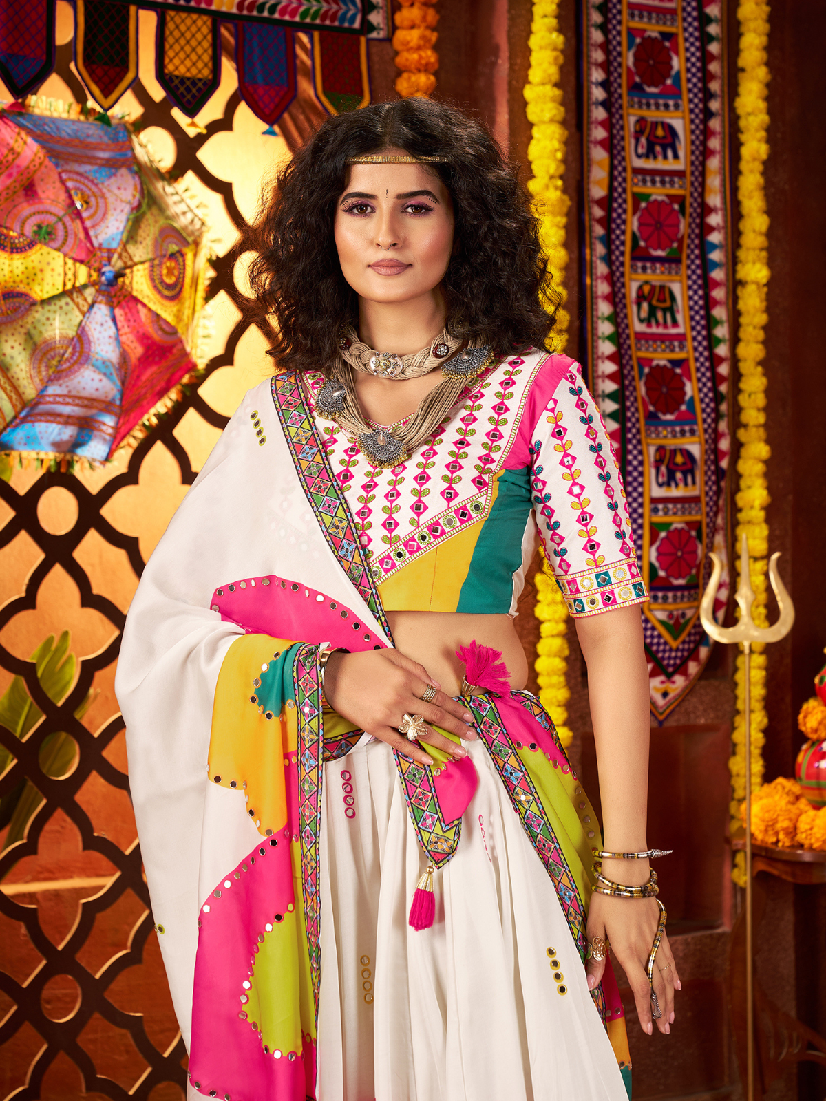 White Lehenga Choli With Vibrant Pink, Green, And Yellow Panel Prints, Folk-Inspired Blouse, And Matching Dupatta With Tassel Detailing—Perfect For Navratri And Festive Celebrations.