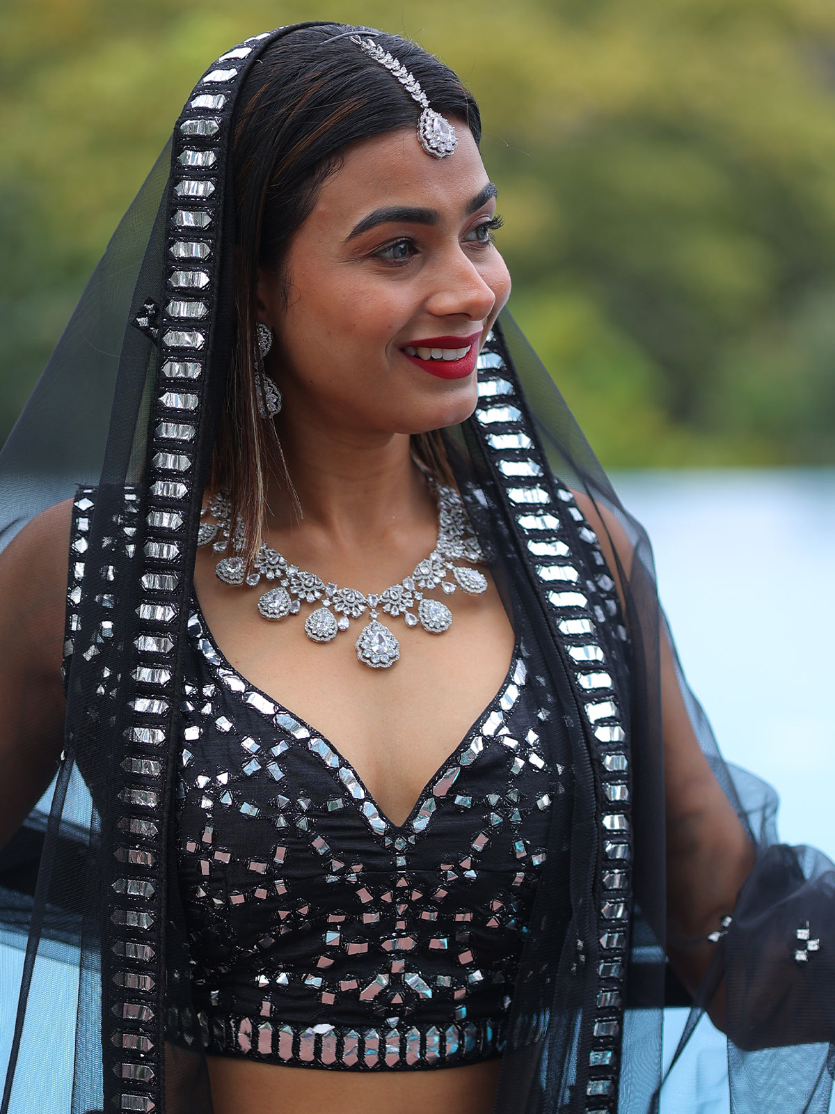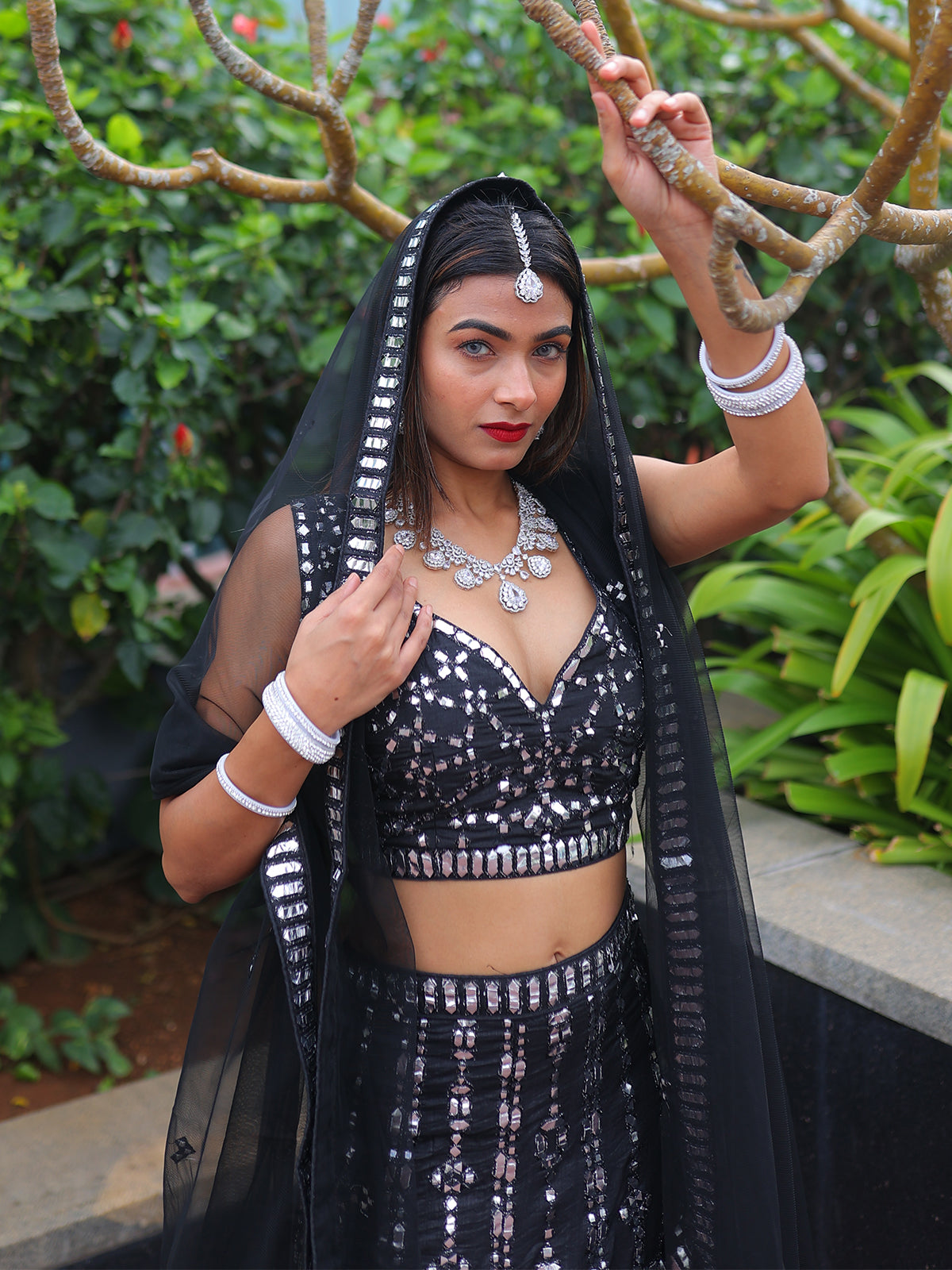 Odette Black Silk Blend Semi Stitched Lehenga With Unstitched Blouse For Women