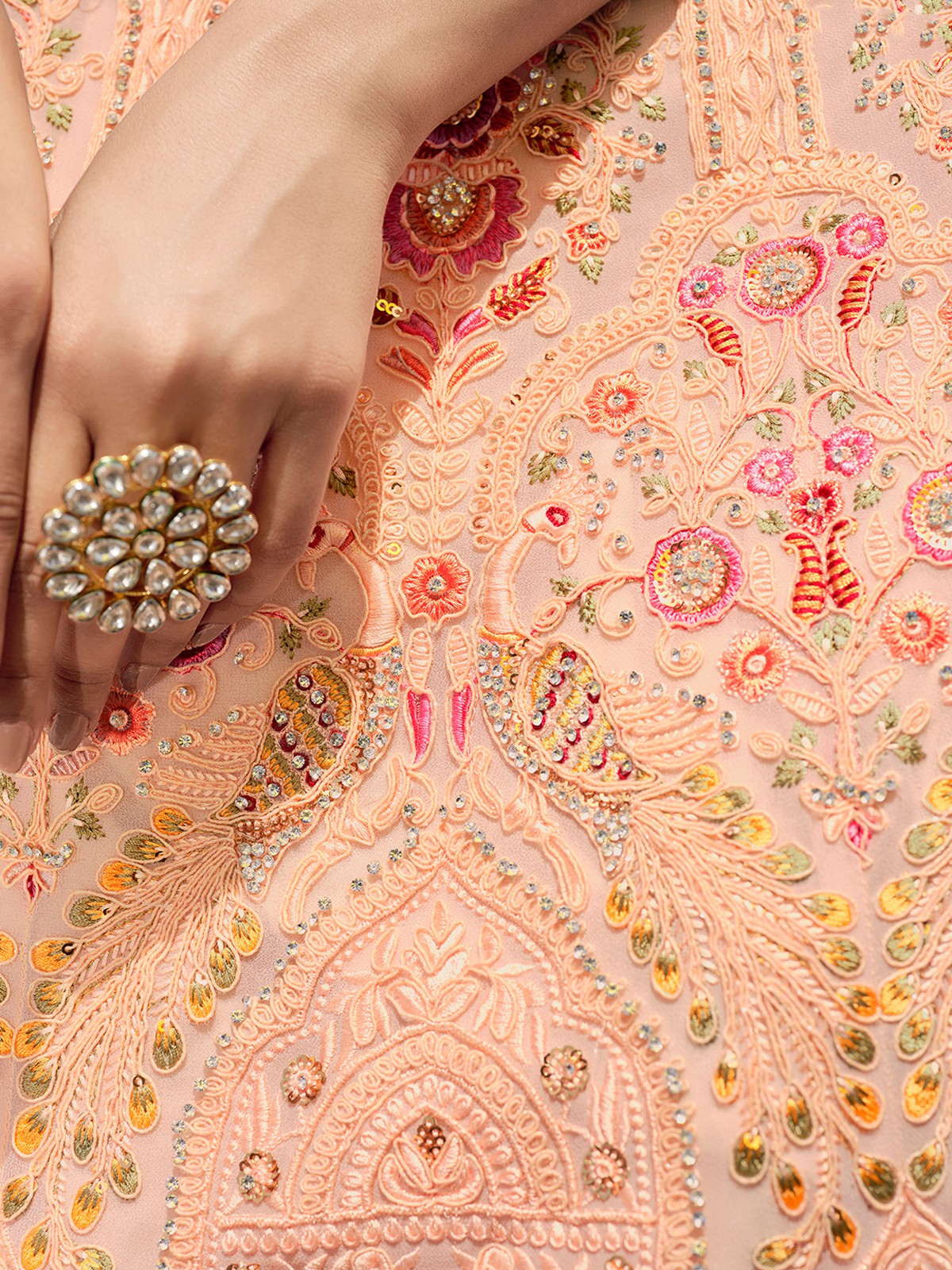 Odette Women Peach Embroidered Georgette Semi Stitched Lehenga With Unstitched Blouse