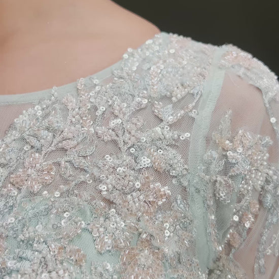 Mint Green Sequins Embroidered Tissue Evening Gown with Round Neck-JE2339