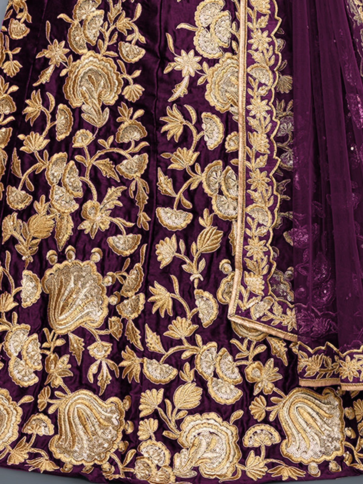 Add light to the celebration called life beaming in this lehenga, choli and dupatta set. Crafted on velvet silk, the set is beautified with embroidery work.